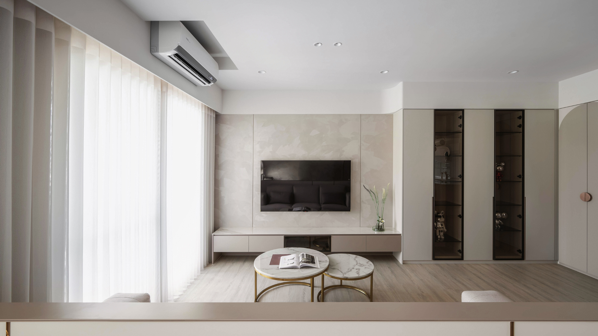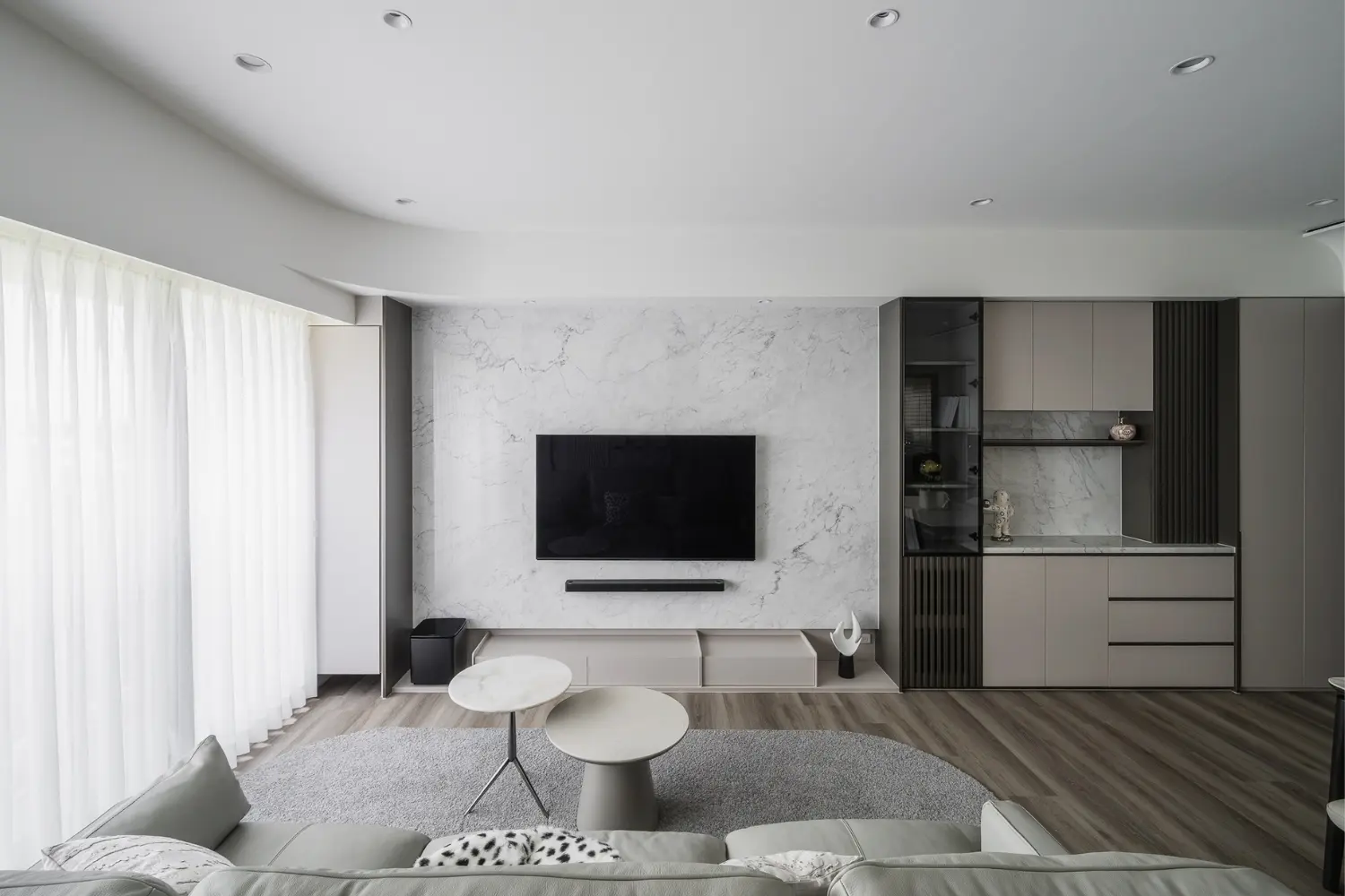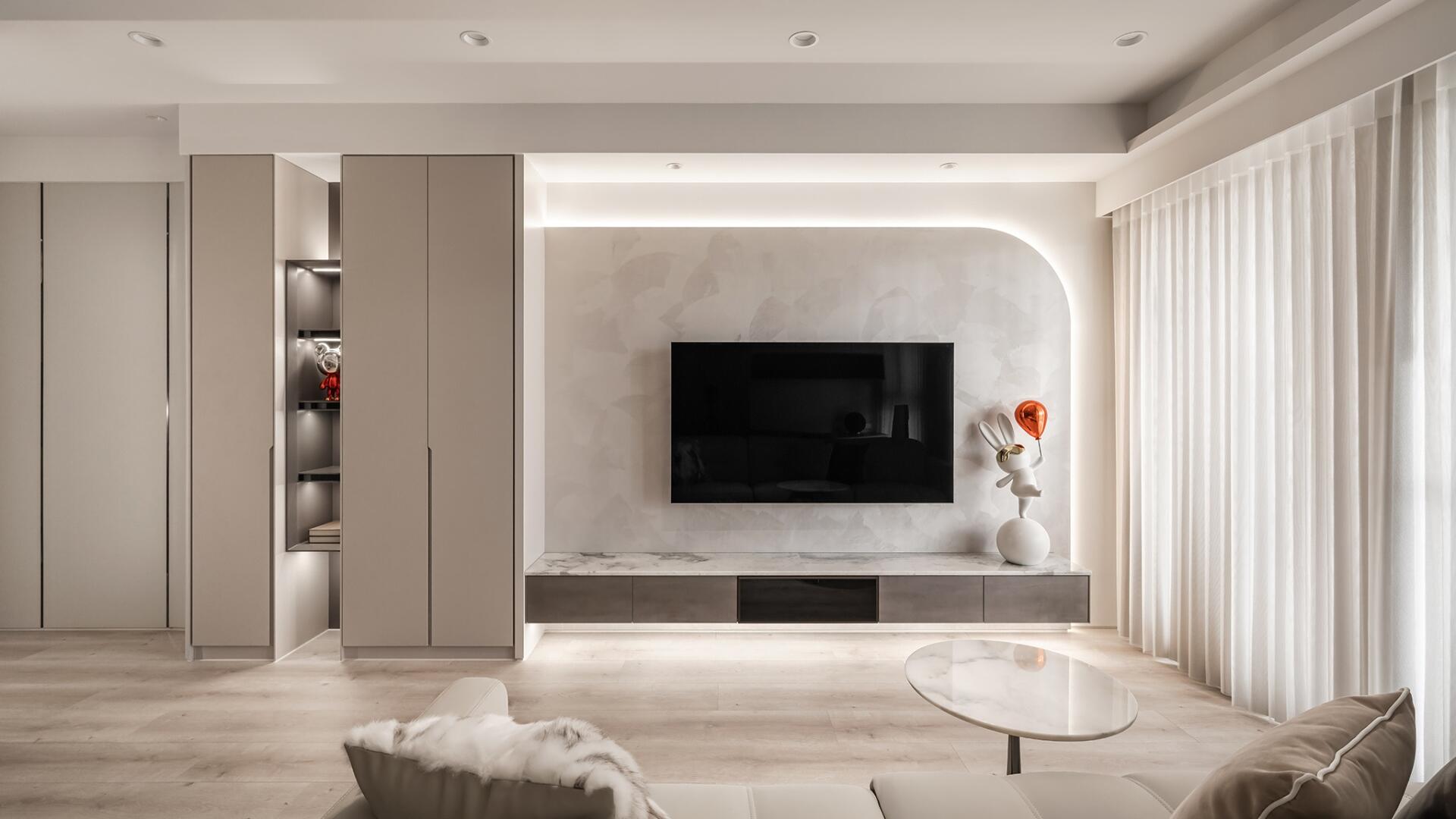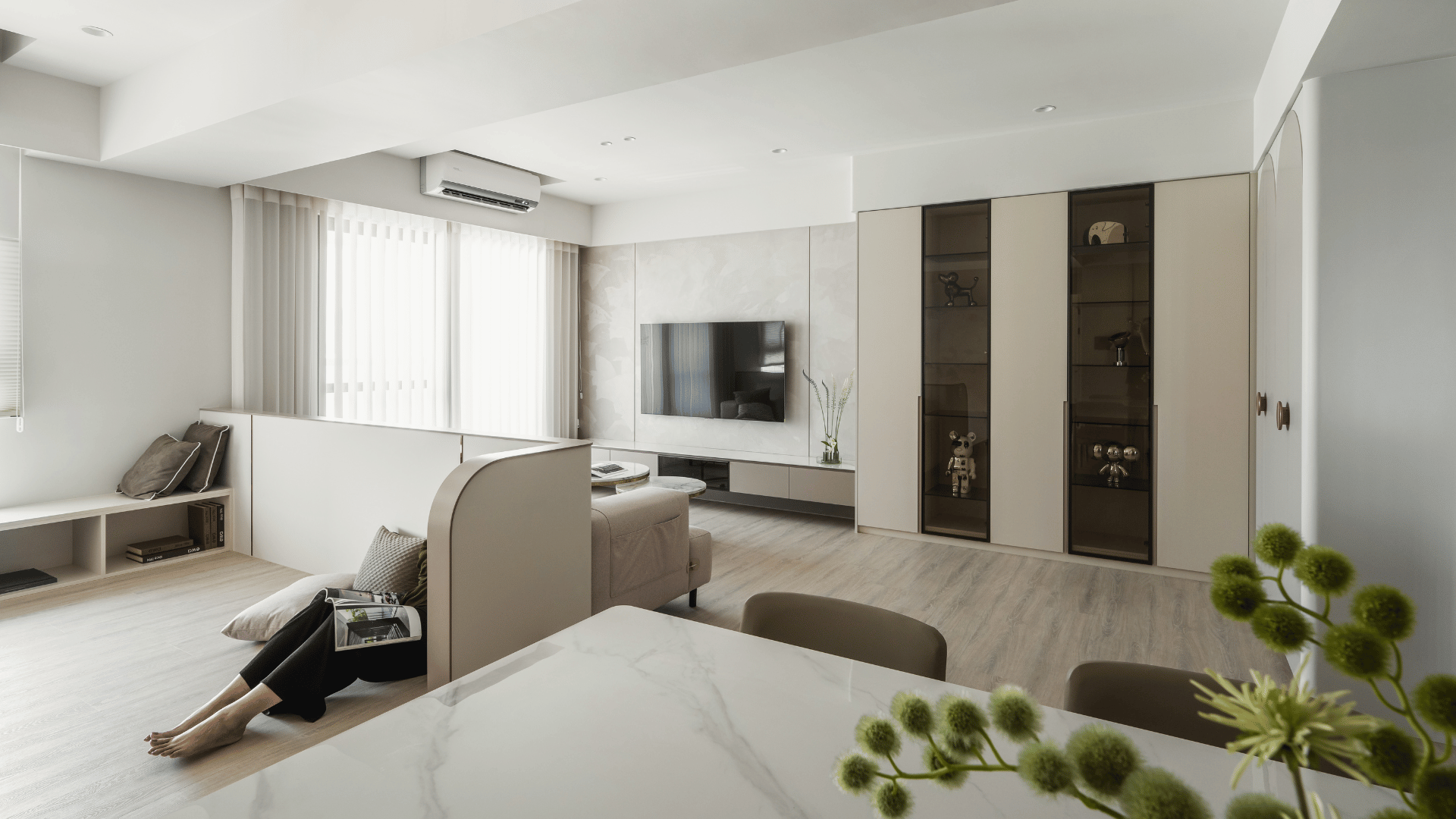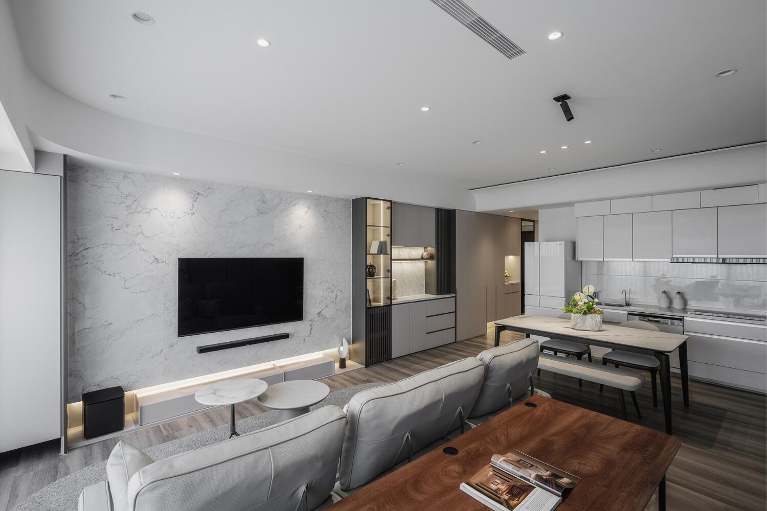 一個現代簡約風的家透過去電視牆化設計、大量展示櫃、圓弧元素及精準的空間規劃,讓家兼具機能與美感