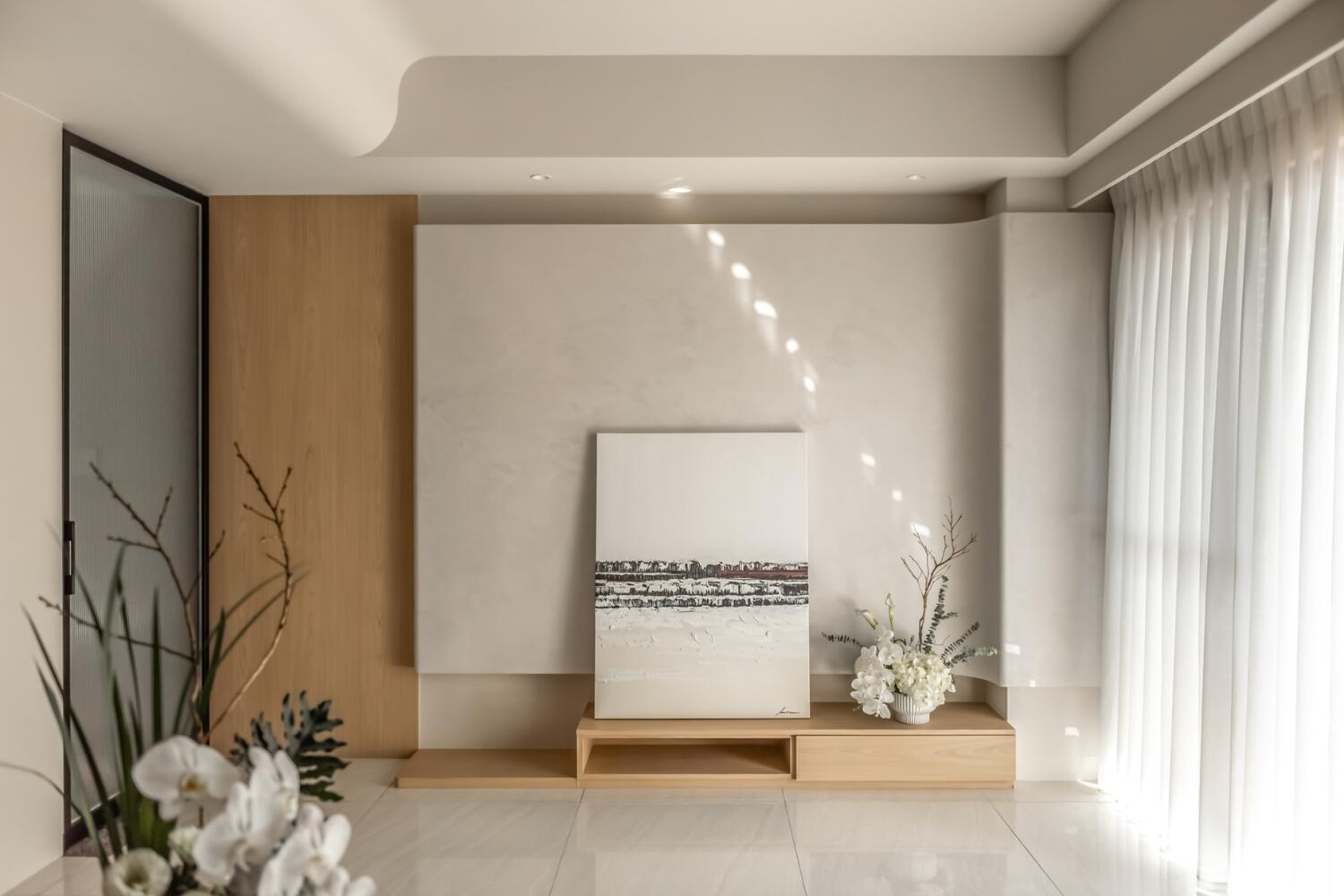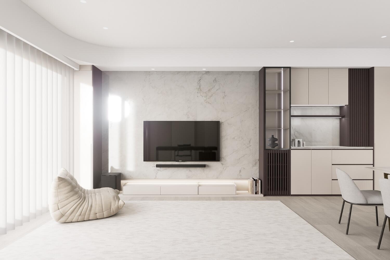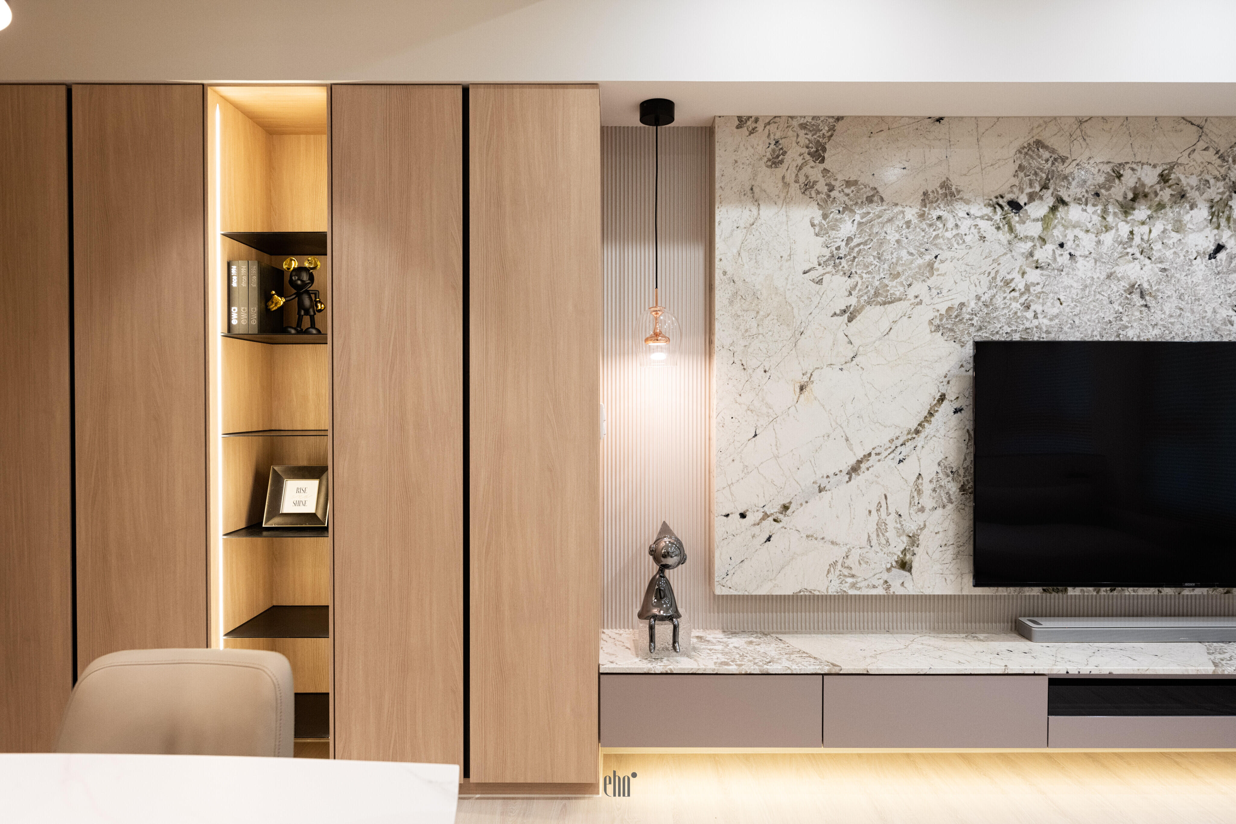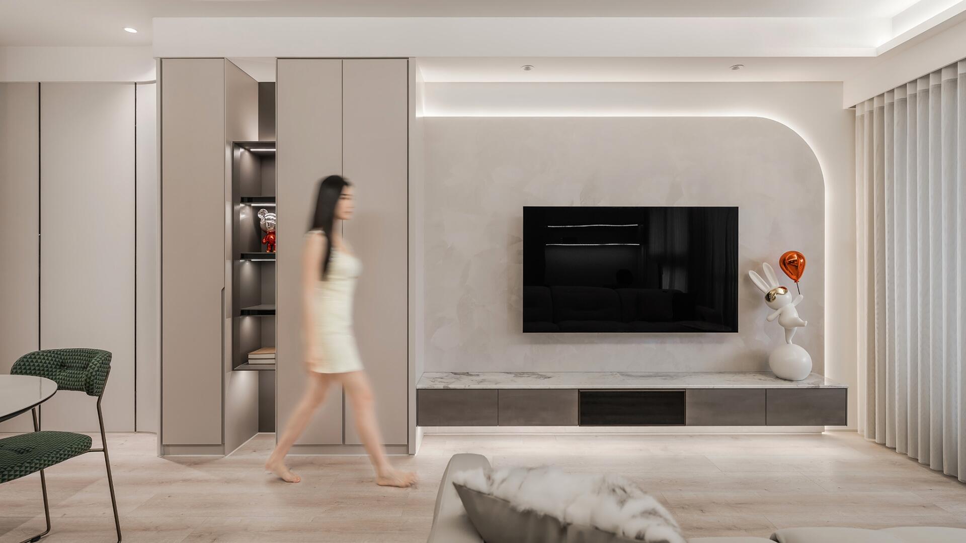 一個現代簡約風的家透過去電視牆化設計、大量展示櫃、圓弧元素及精準的空間規劃,讓家兼具機能與美感