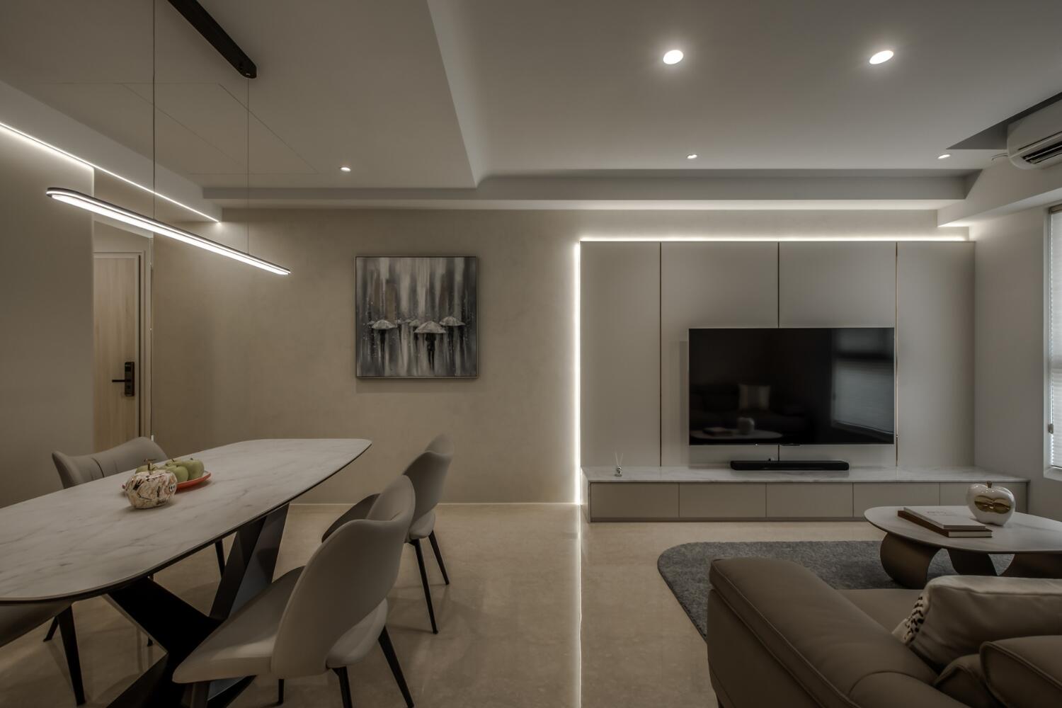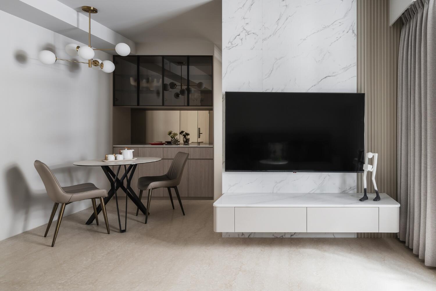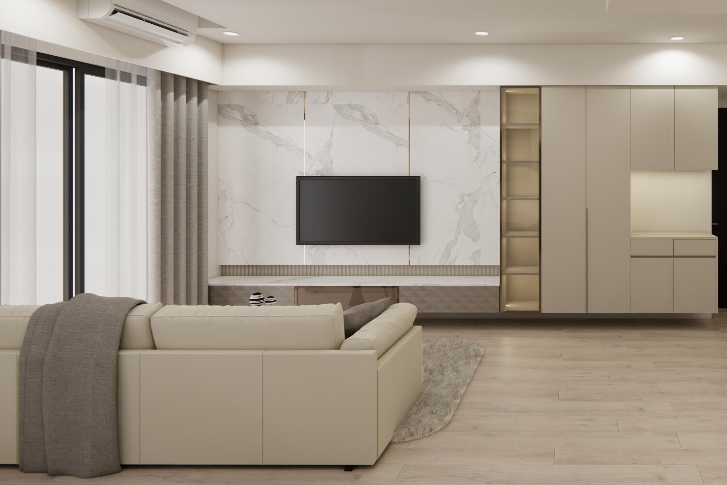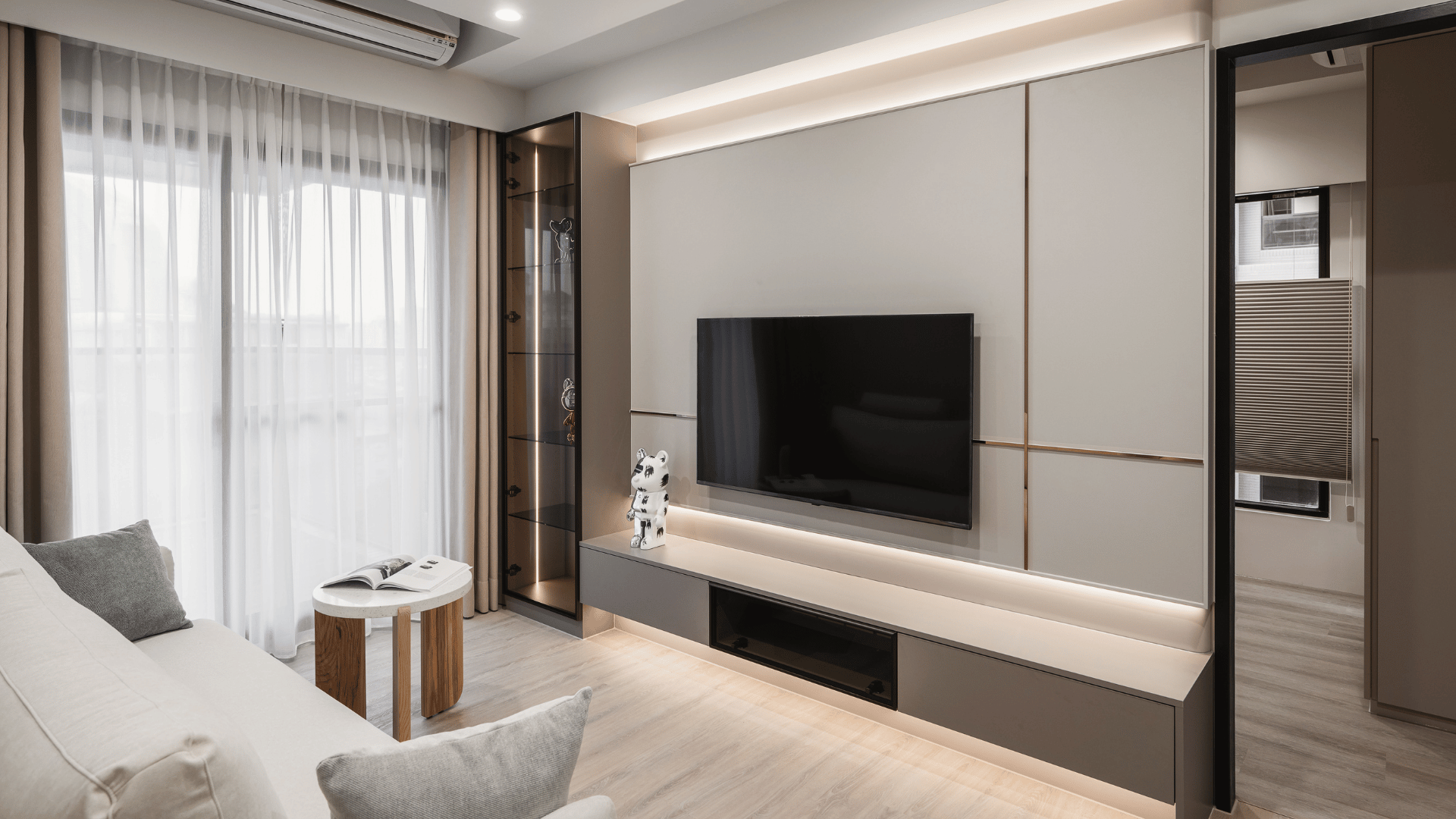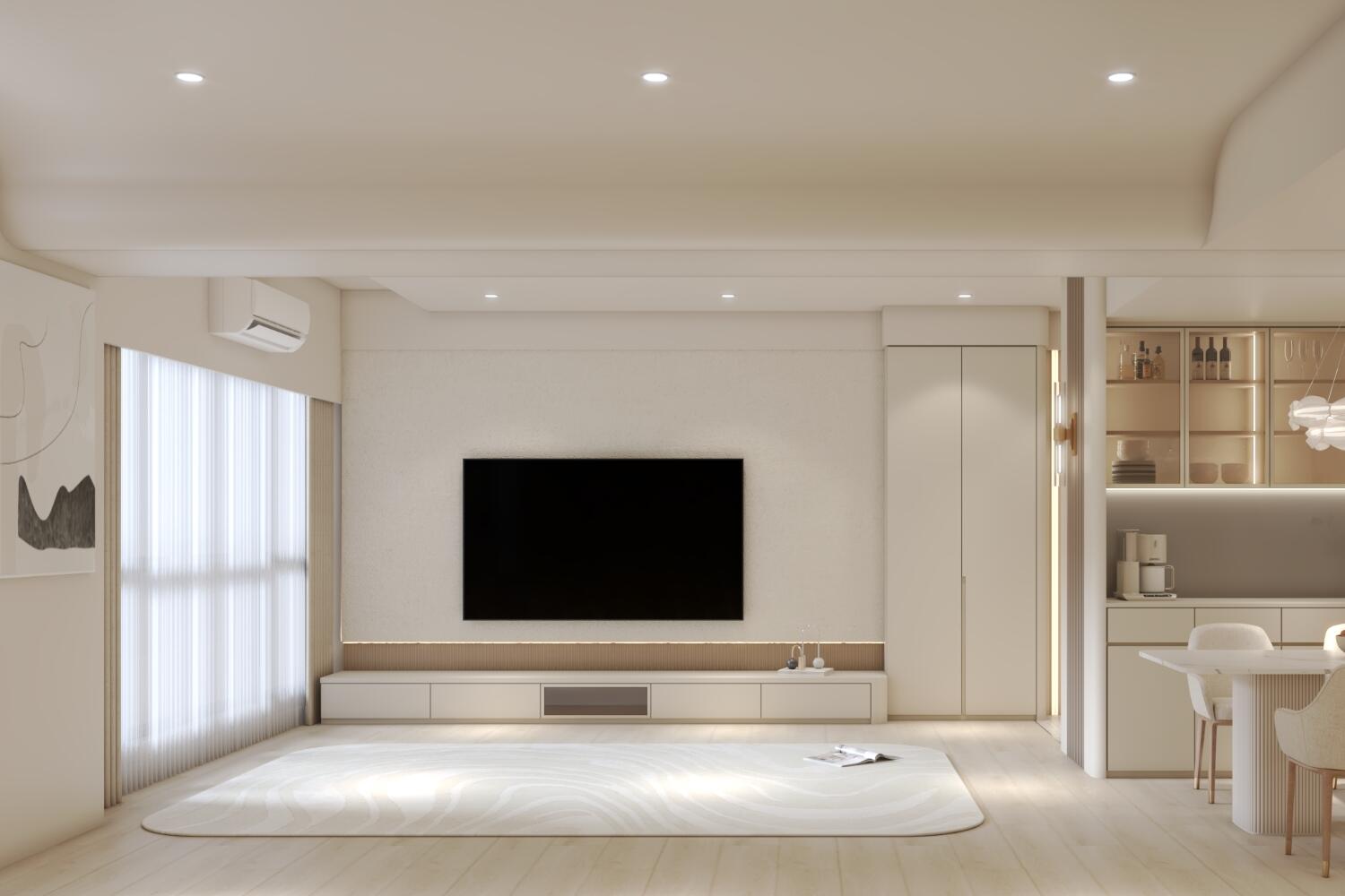 一個現代簡約風的家透過去電視牆化設計、大量展示櫃、圓弧元素及精準的空間規劃,讓家兼具機能與美感