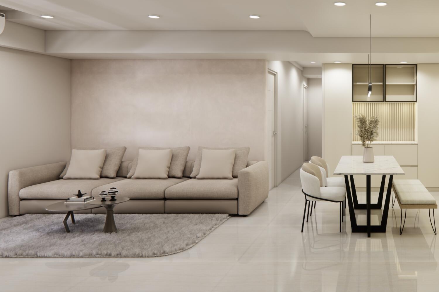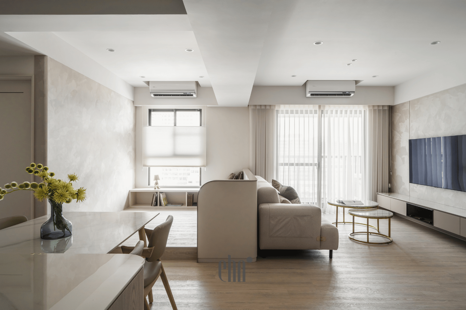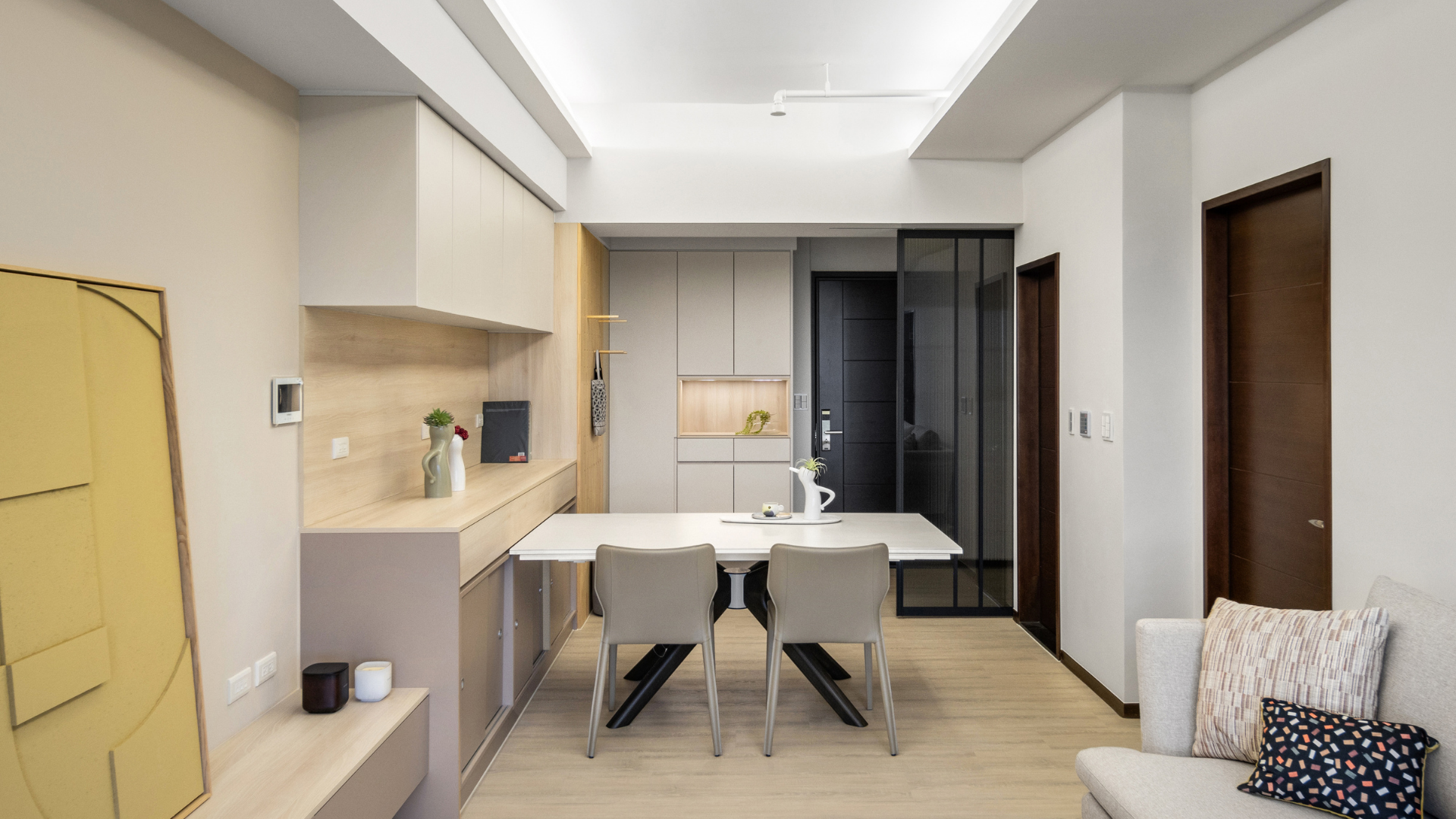 通過動線規劃、系統櫃的巧妙配置及素雅色調的調配,打造簡約俐落的住宅空間,賦予家居多樣的功能和高雅的質感,讓屋主在忙碌的生活中找到片刻寧靜和放鬆。
