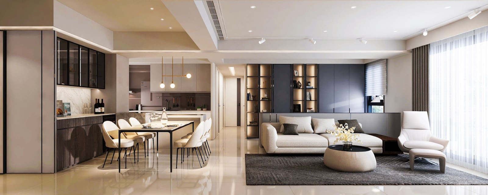 在豪宅客廳,原本就擁有「⼤空間」的原⽣優勢,只要透過對的⾵格、空間規劃、動線設計,就可以讓公領域變成機能完整的「多層次空間」。⽽這多層次空間裡就包含了:⽞關設計、客、餐廳設計、廚房、輕⾷區、書桌……